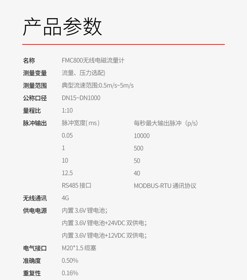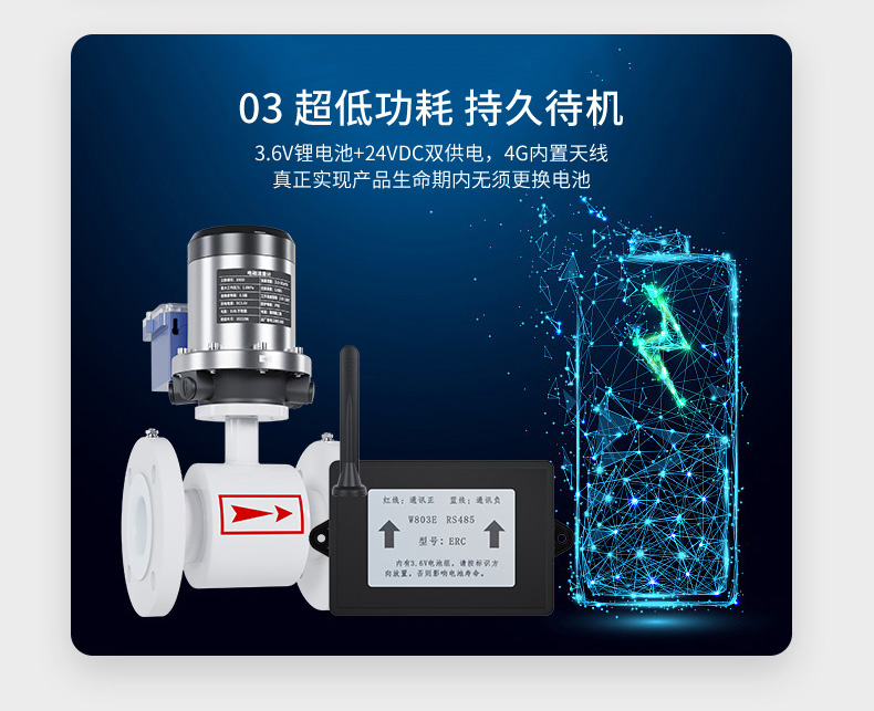 太阳集团tyc4633_FMC800无线电磁流量计由电磁流量计和 4G 无线远传模块共同组成,用于测量封闭管道内导电液体的瞬时流量和累积流量。测量数据通过 4G 信号远传至网络接收平台,用户可以通过浏览器、微信公众号等方式灵活方便地查看数据、远程配置参数等功能,实现智能物联。广泛应用于自来水、化工、煤炭、环保、轻纺、冶金、造纸等行业。 流量转换器为电池供电型转换器,标配一个常规锂电池组,可持续工作 3~6 年。若配用高容量锂电池组,工作时间会更长。