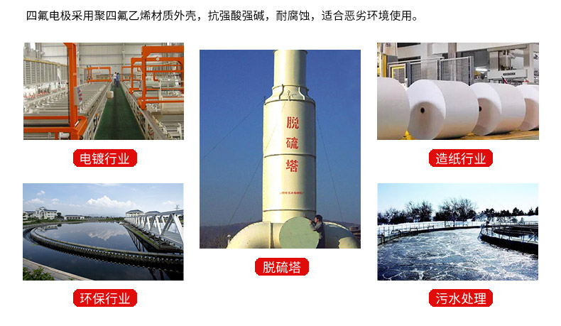 工业在线聚四氟电极采用聚四氟乙烯材质外壳,抗强酸强碱,耐腐蚀,适合恶劣环境使用。可根据客户需要加装各种温补型号PT100/PT1000/NTC 10K等。广泛应用于医药、颜料、涂料、纸浆造纸、中间体、化肥、淀粉、污水处理、环保、电镀废水处理等行业。